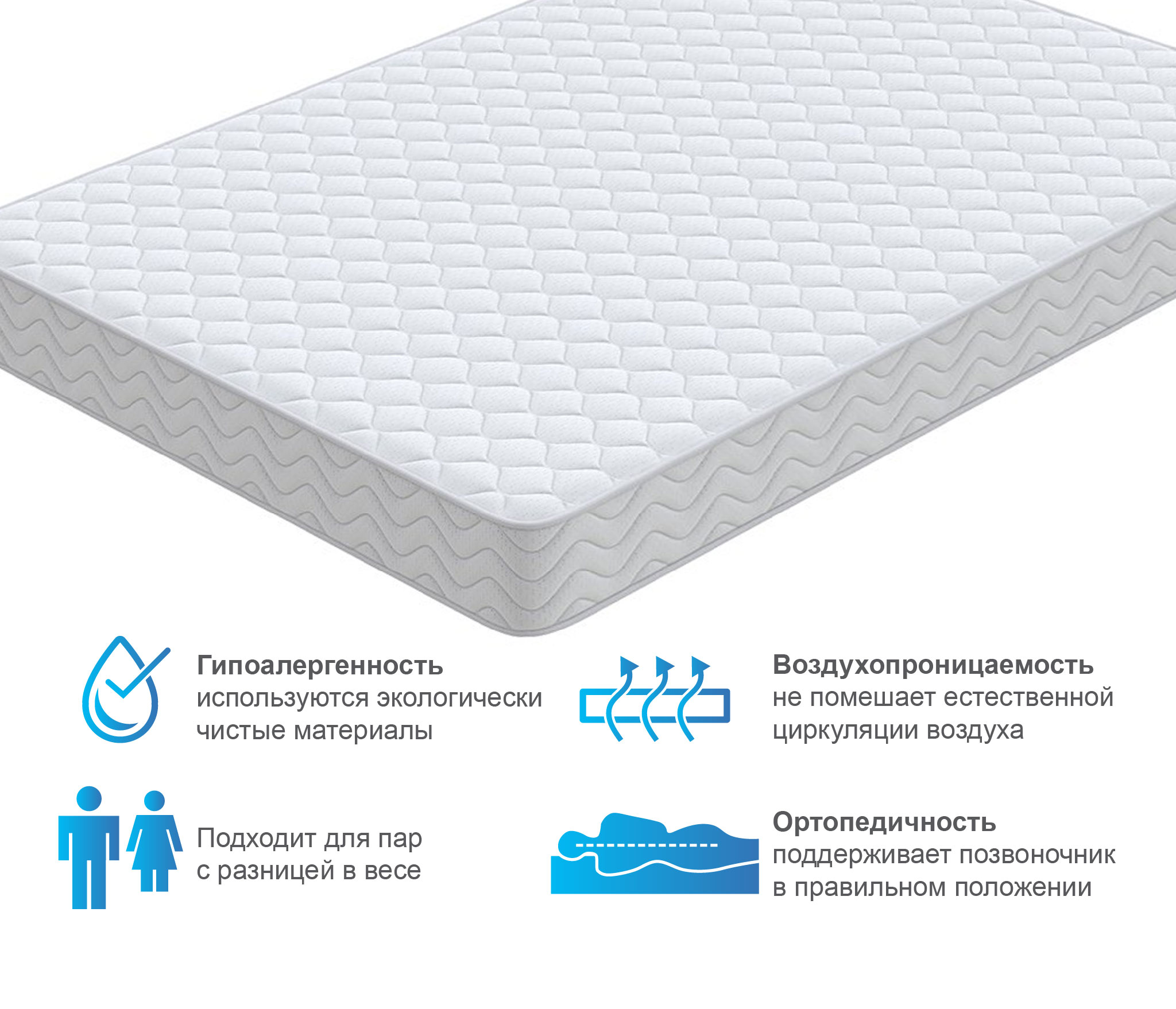 В основе матраса Спринг лежит классический пружинный блок Bonnell, который служит надежной опорой для позвоночника. Наполнитель из эластичного долговечного пенного материала делает матрас комфортным для сна и отдыха. Изолирующий слой из термовойлока придает дополнительную жесткость, а так же за счет своей объемной структуры способствует лучшей циркуляции воздуха.