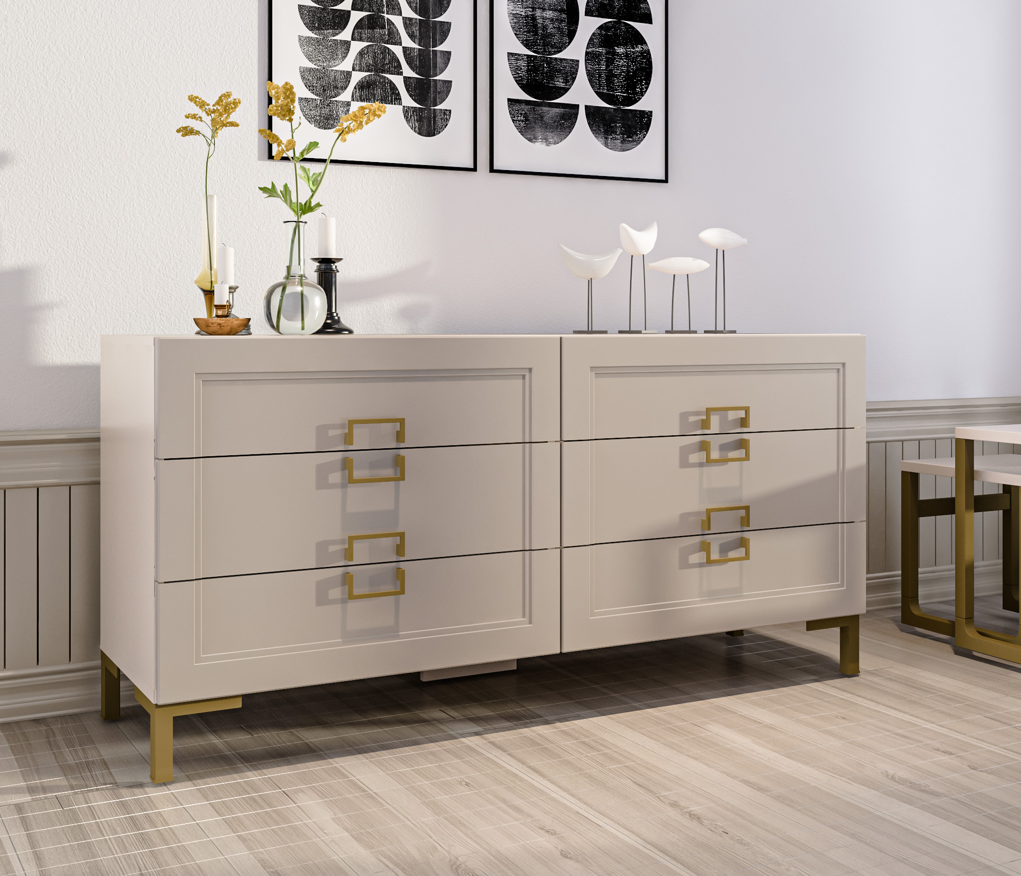 Золотистые ручки и ножки коллекции "Ассоль" добавляют неповторимый шик и изысканность, завершая образ тонким и стильным блеском. Эти акценты создают атмосферу роскоши и утонченности. Они играют роль визуального украшения, дополняя общий вид мебели и придавая ей особый шарм и элегантность.